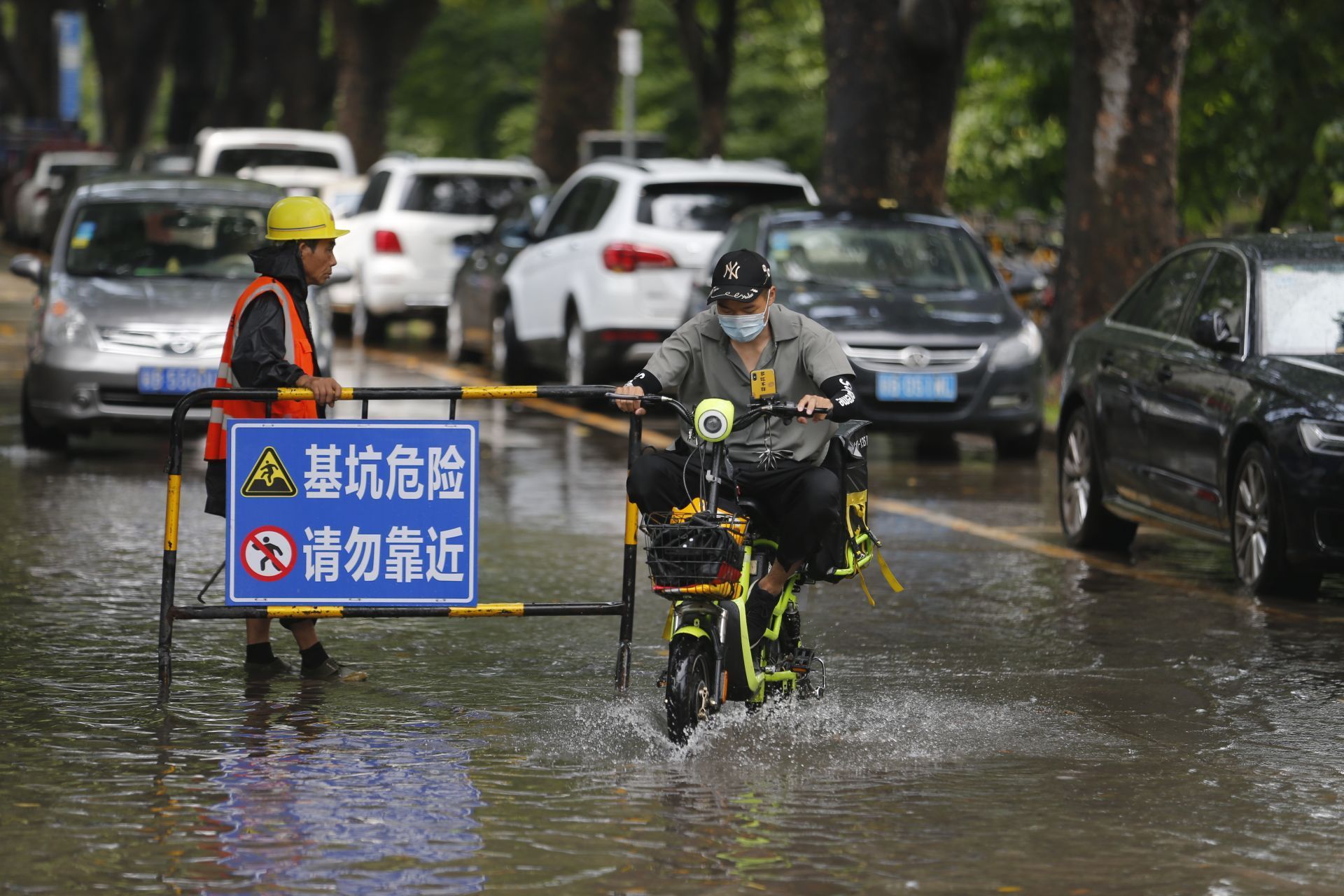 2020年5月26日中午13:46分,商報(bào)東二路,短時(shí)強(qiáng)降水導(dǎo)致路面水浸,一位騎士經(jīng)過(guò)水浸路面。