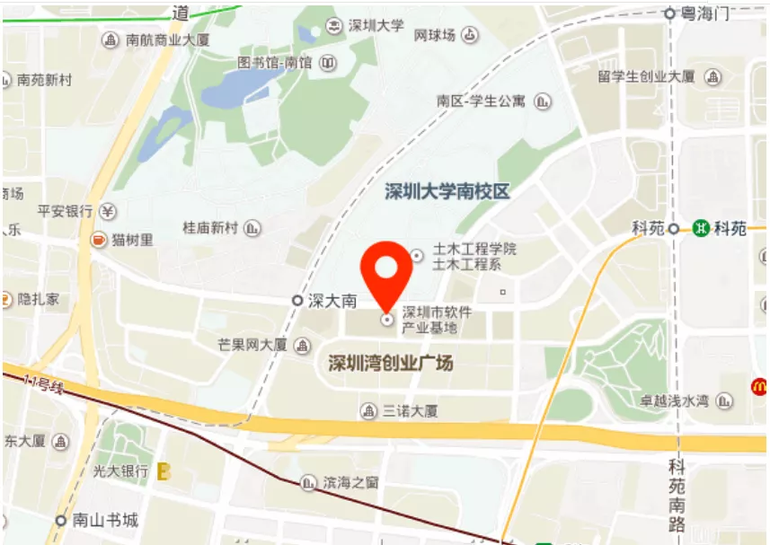 深圳市軟件產(chǎn)業(yè)基地,東接科技公園,西臨白石路,南靠濱海大道,北至學(xué)府路,中間科園路南北穿越。
