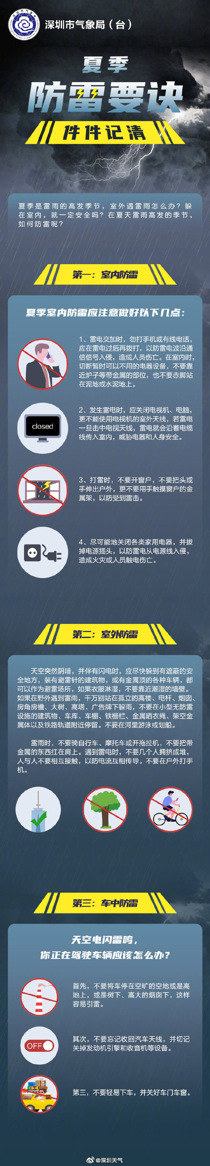 深圳市氣象臺于2020年06月05日11時15分在全市發(fā)布雷電預警,預計2小時內(nèi)全市將受雷電影響,市民停留在安全地方;按照防御預案停止戶外易燃易爆危險作業(yè),并加強?;瘓鏊踩芾?。