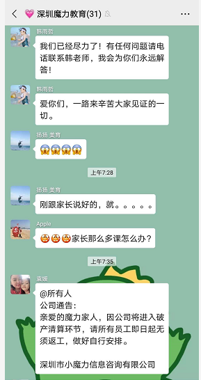 一名丁姓家長介紹,5月20日,家長接到美育老師消息,稱公司剛剛宣布破產(chǎn),老師工資被拖欠4個月。家長介紹,老師曝光該消息后,培訓(xùn)機構(gòu)支付了他們的拖欠工資。隨后大量老師離職。