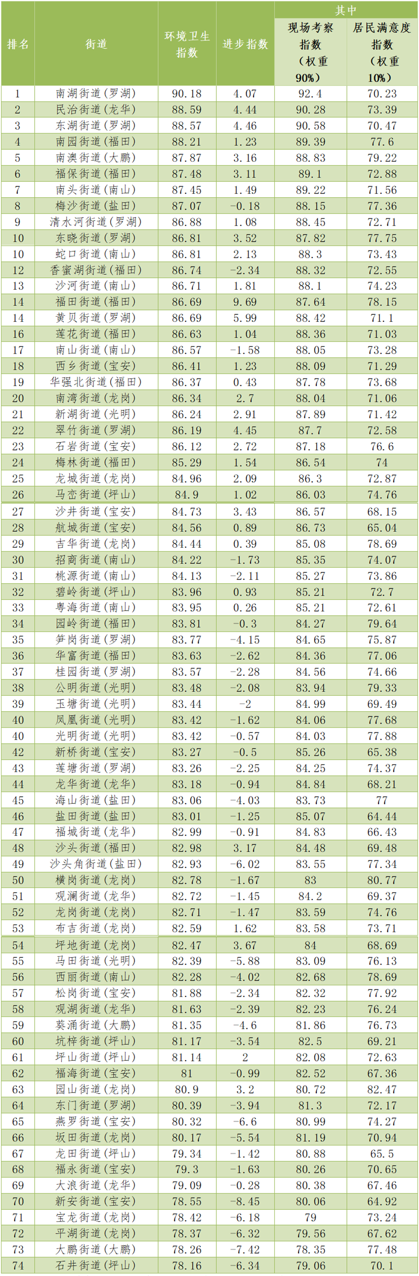 各街道環(huán)境衛(wèi)生進步指數(shù)得分排名第1名的是福田街道(福田),第2名是黃貝街道(羅湖),第3名是東湖街道(羅湖),第4名是翠竹街道(羅湖),第5名是民治街道(龍華)。