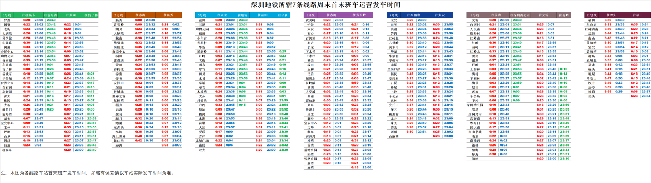 據(jù)介紹,周末期間1號(hào)線羅湖、機(jī)場(chǎng)東首班車時(shí)間提前至6:20,部分中間站的首班車最早提前至6:05左右;半程末班車服務(wù)延長(zhǎng)至23:40分,分別從羅湖往前海灣、機(jī)場(chǎng)東往竹子林方向發(fā)車。2號(hào)線往新秀方向部分中間站首班車提前至6:00,往赤灣方向末班車延長(zhǎng)至23:30。3號(hào)線部分中間站的首班車提前至6:05左右;半程末班列車服務(wù)保持原有的23:30,分別從益田往塘坑、雙龍往華新發(fā)車。9號(hào)線部分中間站的首班車最早提前至6:05左右;半程末班列車服務(wù)延長(zhǎng)至23:30,分別從文錦至深圳灣公園、前灣至孖嶺發(fā)車。