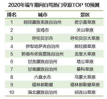 6月正是“草原游”較為適宜的時節(jié),廣袤的草原游可為這個夏天增添一絲清涼?!秷蟾妗奉A(yù)測,端午小長假期間,全國熱門自駕草原TOP10主要分布在市郊,最熱門的是阿壩-若爾蓋草原,其次是寶雞-關(guān)山草原以及呼倫貝爾大草原。
