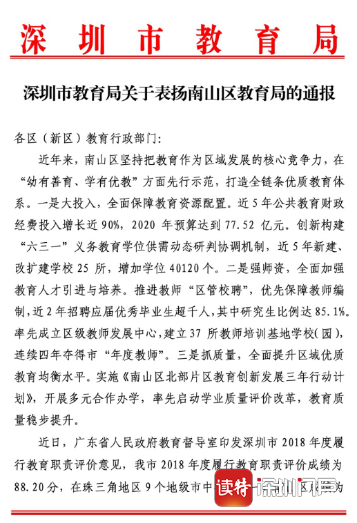 見(jiàn)圳客戶端·深圳新聞網(wǎng)2020年7月1日訊(深圳特區(qū)報(bào)記者 李麗)6月30日,《深圳市教育局關(guān)于表?yè)P(yáng)南山區(qū)教育局的通報(bào)》在全市教育界引起關(guān)注。通報(bào)表示,近日,廣東省人民政府教育督導(dǎo)室印發(fā)深圳市2018年度履行教育職責(zé)評(píng)價(jià)意見(jiàn),深圳2018年度履行教育職責(zé)評(píng)價(jià)成績(jī)?yōu)?8.20分,在珠三角地區(qū)9個(gè)地級(jí)市中排名第一,其中,南山區(qū)成績(jī)?yōu)?8.64分,在珠三角地區(qū)48個(gè)縣(市、區(qū))中排名第一。經(jīng)研究,決定在全市教育系統(tǒng)對(duì)南山區(qū)教育局給予通報(bào)表?yè)P(yáng),并希望南山區(qū)教育局率先建成全國(guó)義務(wù)教育優(yōu)質(zhì)均衡發(fā)展區(qū)。