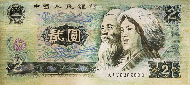第三套人民幣2元票面總體設(shè)計(jì)手繪原大效果圖。