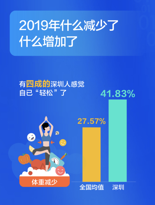 深圳人比較關(guān)注健康,不管是宅在家還是外出娛樂,他們選擇運(yùn)動(dòng)健身的比例都超過全國平均水平,對健康的投資,成就了又一個(gè)“苗條之城”。過去這一年,有四成的深圳人感覺自已“輕松”了,體重減少的人群比例高出全國近14個(gè)百分點(diǎn)。甩掉了贅肉的同時(shí),深圳人還感覺在時(shí)間、朋友、收入這三方面的收獲在增加。尤其是時(shí)間,超出了全國均值8個(gè)百分點(diǎn)。