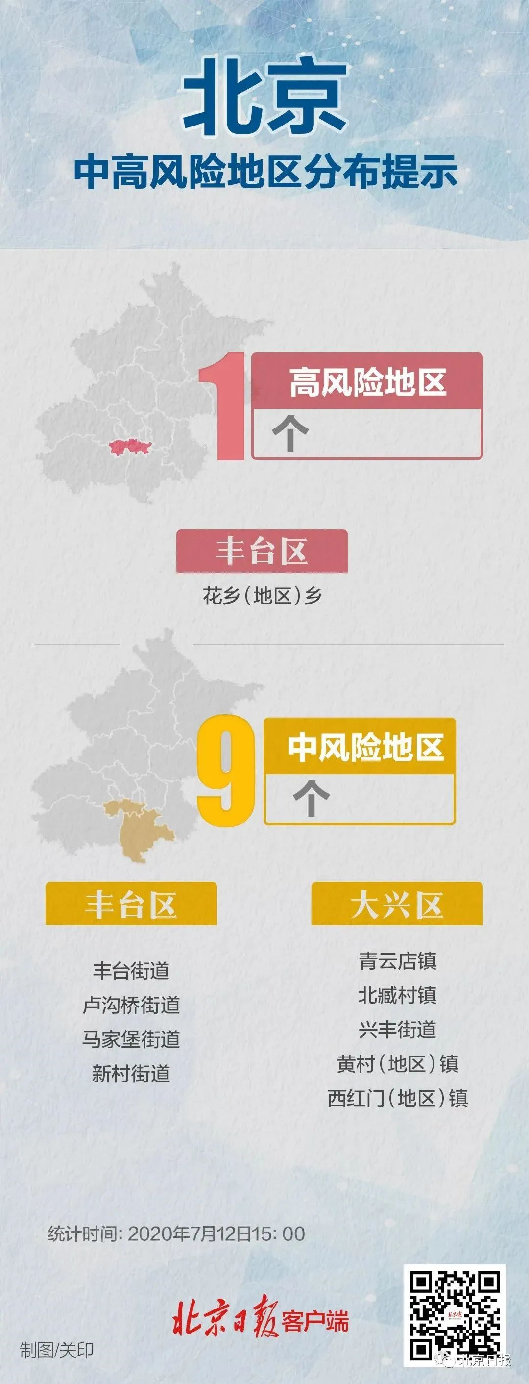 按照北京市向國家衛(wèi)生健康委報(bào)備的《常態(tài)化防控下北京市新冠肺炎疫情風(fēng)險(xiǎn)分區(qū)分級標(biāo)準(zhǔn)》,經(jīng)評估,豐臺區(qū)盧溝橋(地區(qū))鄉(xiāng)、大興區(qū)魏善莊鎮(zhèn)、大興區(qū)高米店街道連續(xù)14天內(nèi)無新增本地確診病例,由中風(fēng)險(xiǎn)地區(qū)調(diào)整為低風(fēng)險(xiǎn)地區(qū)。