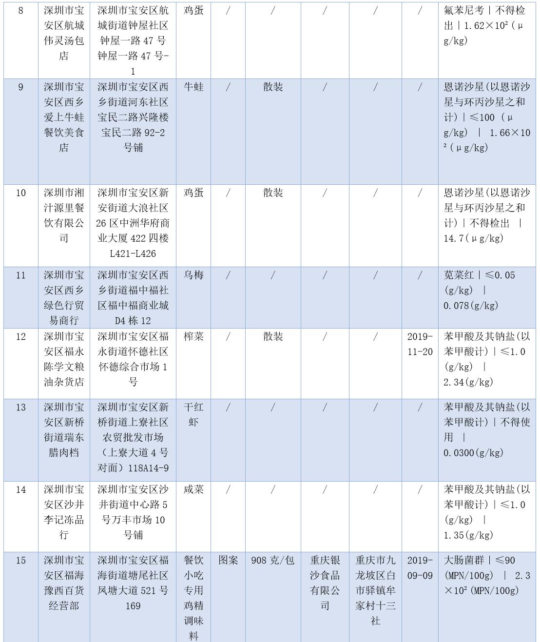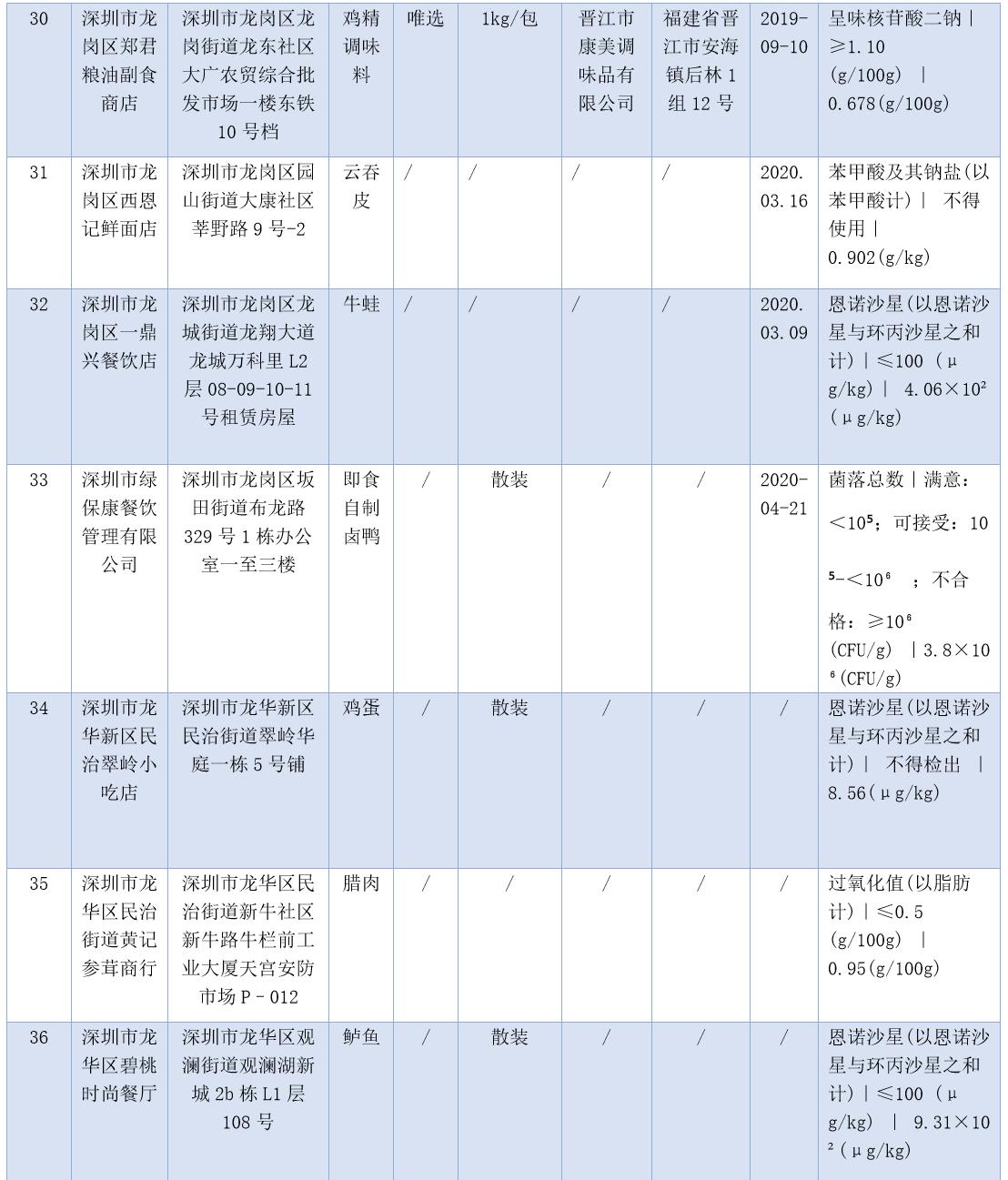 見圳客戶端·深圳新聞網(wǎng)2020年7月17日訊(晶報(bào)記者 鄧裴裴/制圖)7月17日,深圳市市場監(jiān)督管理局官網(wǎng)發(fā)布了2020年第二十二期食品安全抽樣檢驗(yàn)情況通報(bào),3-5月,共抽檢生產(chǎn)、流通、餐飲環(huán)節(jié)食品1229批次,發(fā)現(xiàn)不合格樣品47批次。記者注意到,不少不合格樣品抽檢單位為餐飲店,包括皇軒酒店、窯雞王、愛上牛蛙、御可奶茶等,還有些小吃店、腸粉店、螺獅粉店紛紛上榜。涉及不合格項(xiàng)目類別包括農(nóng)藥殘留、獸藥殘留、食品添加劑、微生物污染、品質(zhì)指標(biāo)、金屬等元素污染物。