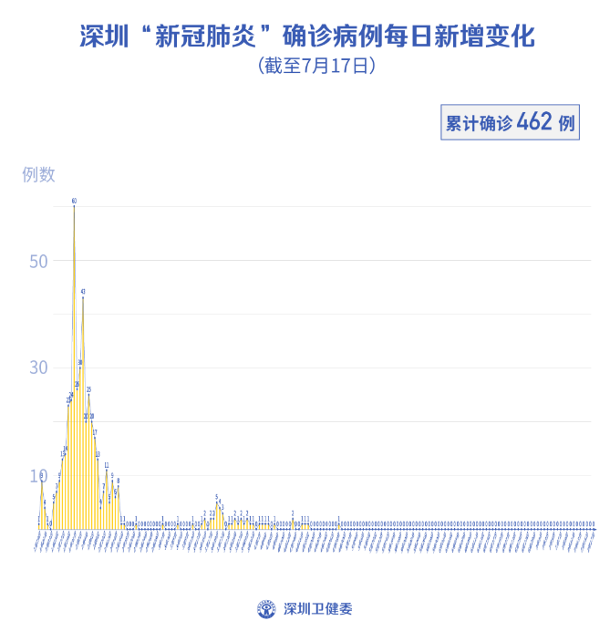截至7月17日24時,深圳累計報告新冠肺炎病例462例。