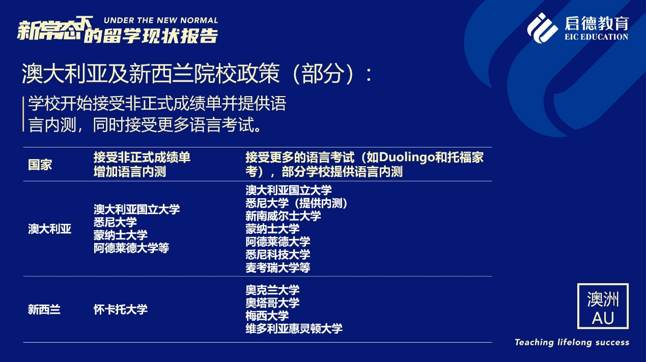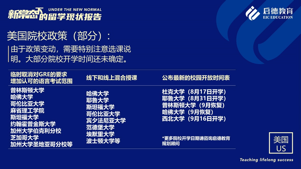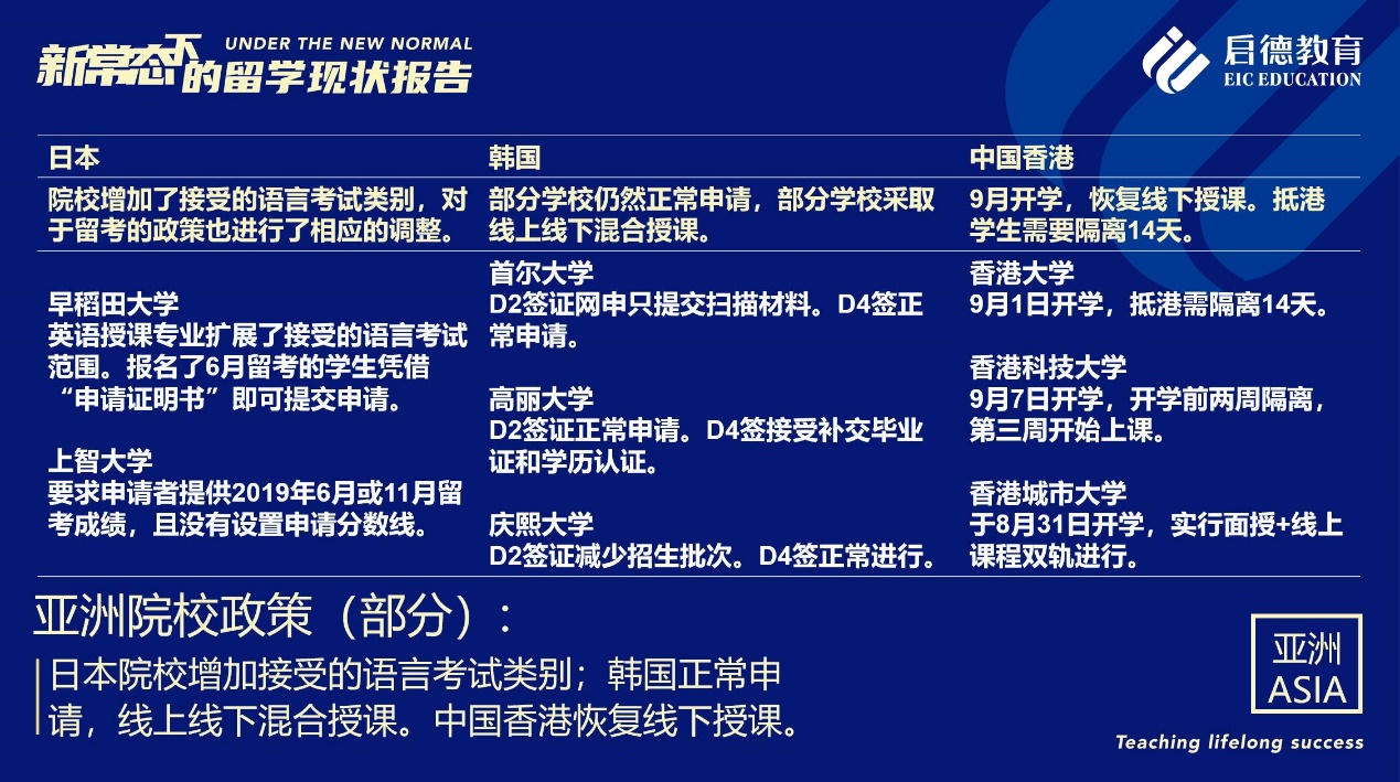 《報(bào)告》也梳理了近期各主要留學(xué)目的國(guó)及院校針對(duì)國(guó)際學(xué)生出臺(tái)的各類政策。據(jù)啟德留學(xué)英愛項(xiàng)目總監(jiān)孫波介紹,國(guó)內(nèi)英國(guó)簽證中心已經(jīng)重新開放。準(zhǔn)備赴英讀研的學(xué)生,部分大學(xué)明確表示秋季可以正常開學(xué),大課將會(huì)采用線上授課的方式,小班授課線下進(jìn)行;還有部分大學(xué)向?qū)W生提供更加靈活的入讀方案,學(xué)生可以選擇9月入讀或者1月入讀。此外,從2021年開始,在英國(guó)完成博士學(xué)位的國(guó)際學(xué)生將會(huì)獲得3年有效期的 PSW工作簽證,本科生和碩士生可以獲得2年有效期的 PSW工作簽證。