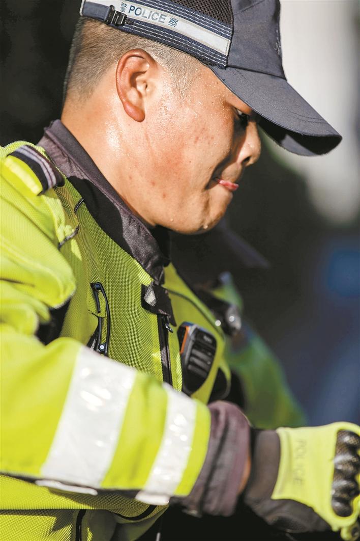 “深圳最近的天氣太熱了,到了中午,地面溫度估計得有40℃了,我們因為戴著口罩,外頭還得加上頭盔,感覺確實挺難受的。”深圳交警南山大隊機訓(xùn)中隊的鐵騎小哥時云財,每天早高峰開始就駕駛鐵騎穿梭在大街小巷,直到中午太陽最盛的時候。摘下頭盔,眼睫毛上都是汗滴,更不用說脫下熒光黃的制服,里面是層層疊疊早已被浸透發(fā)白的衣衫。