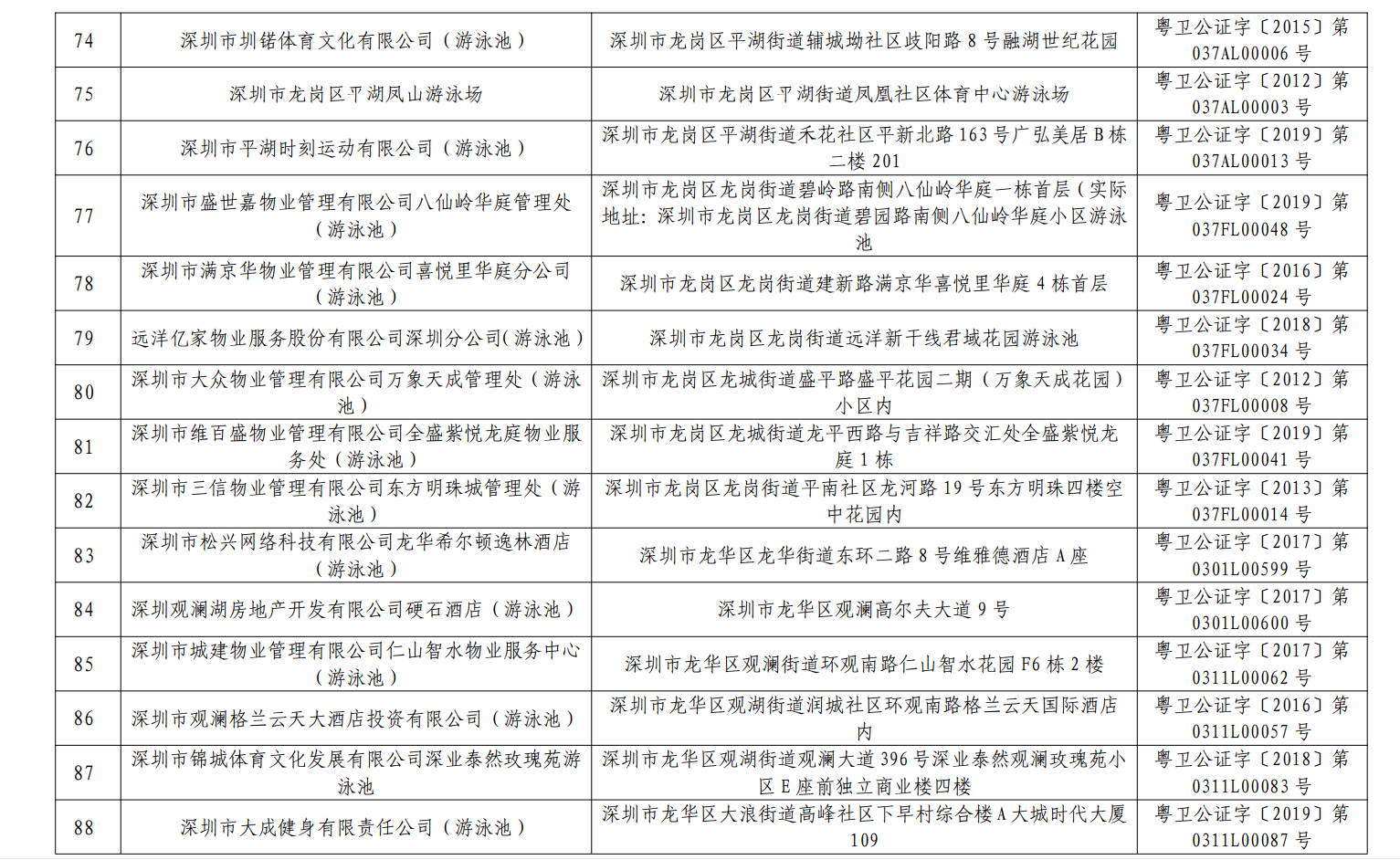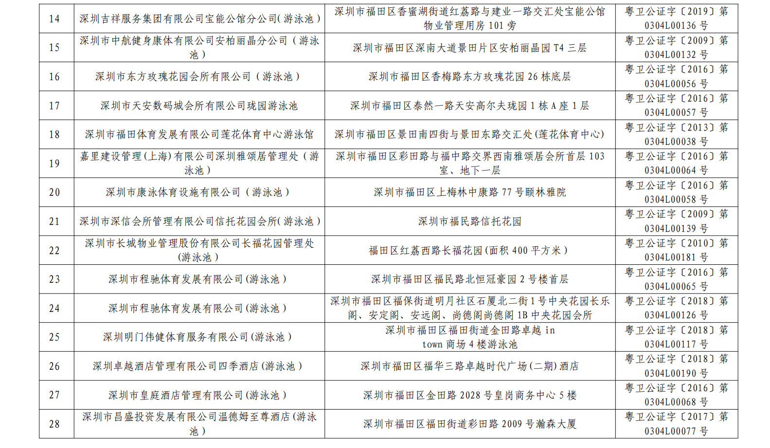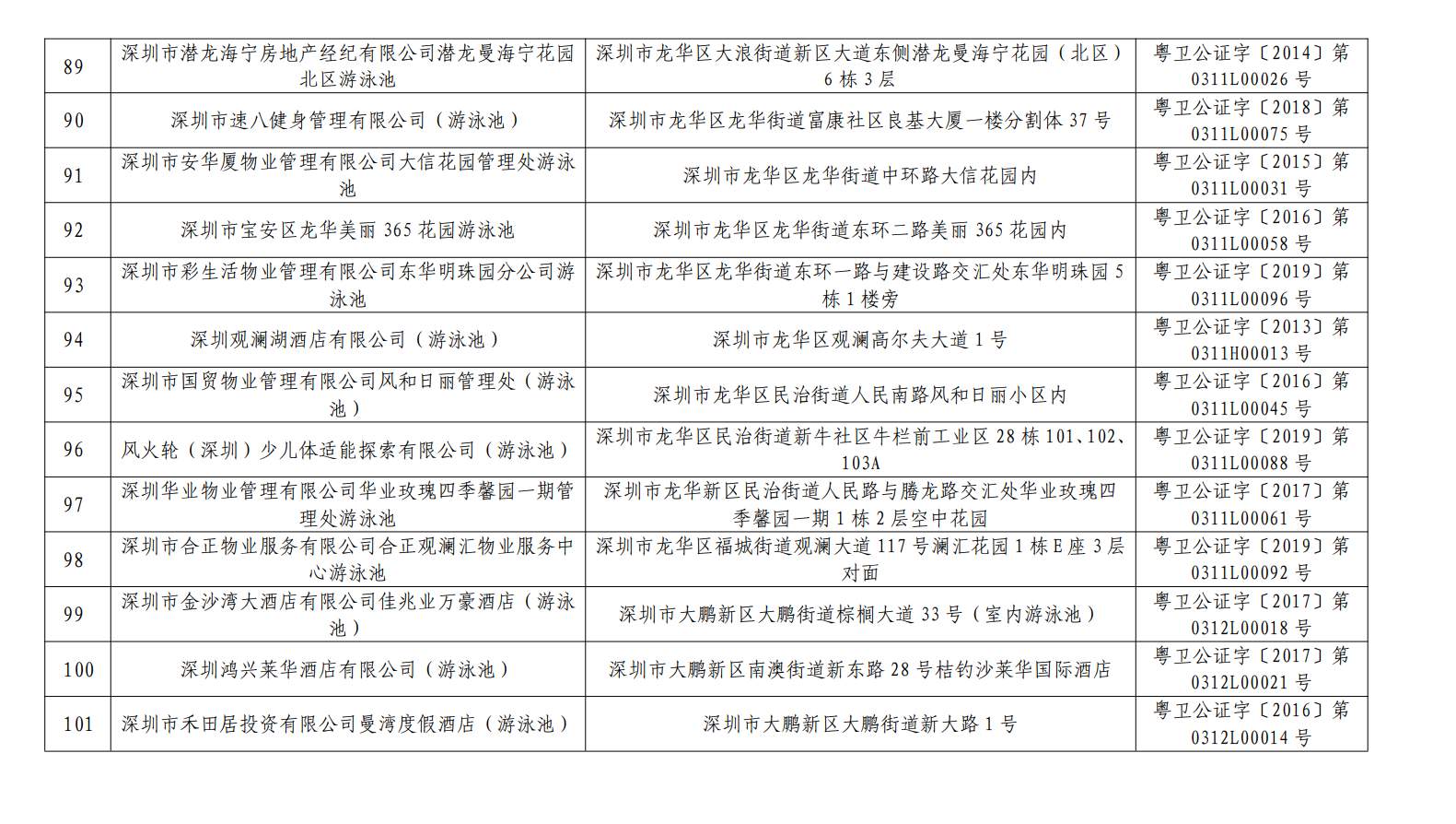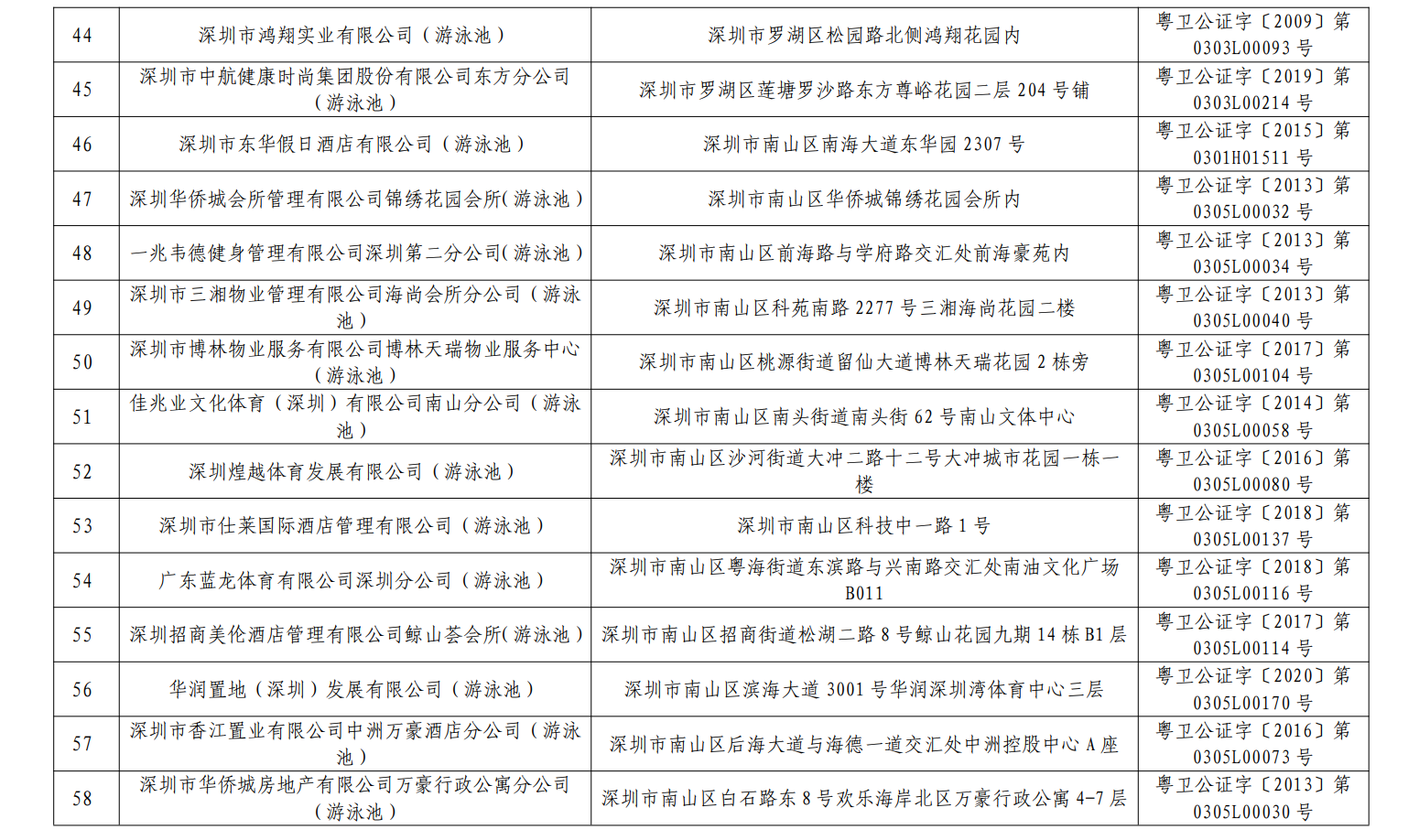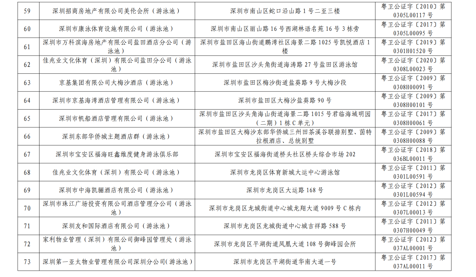 2020年深圳市游泳場所水質(zhì)第一批抽檢結(jié)果合格單位一覽表(101家)