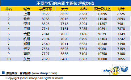 上海、北京、深圳、廣州這些一線城市的應(yīng)屆生平均起薪相對(duì)較高。一般而言,在各城市中,隨著學(xué)歷的提高,應(yīng)屆生起薪也會(huì)相應(yīng)增加。但由于職業(yè)或行業(yè)的人才缺口較大,使得某些職位盡管學(xué)歷不限或僅要求大專(zhuān)學(xué)歷,但其薪酬卻相對(duì)較高。例如,上海有的職位學(xué)歷不限或要求大專(zhuān)以上,但起薪要高于本科崗位,這也間接反映出應(yīng)屆生就業(yè)市場(chǎng)存在明顯的結(jié)構(gòu)矛盾。
