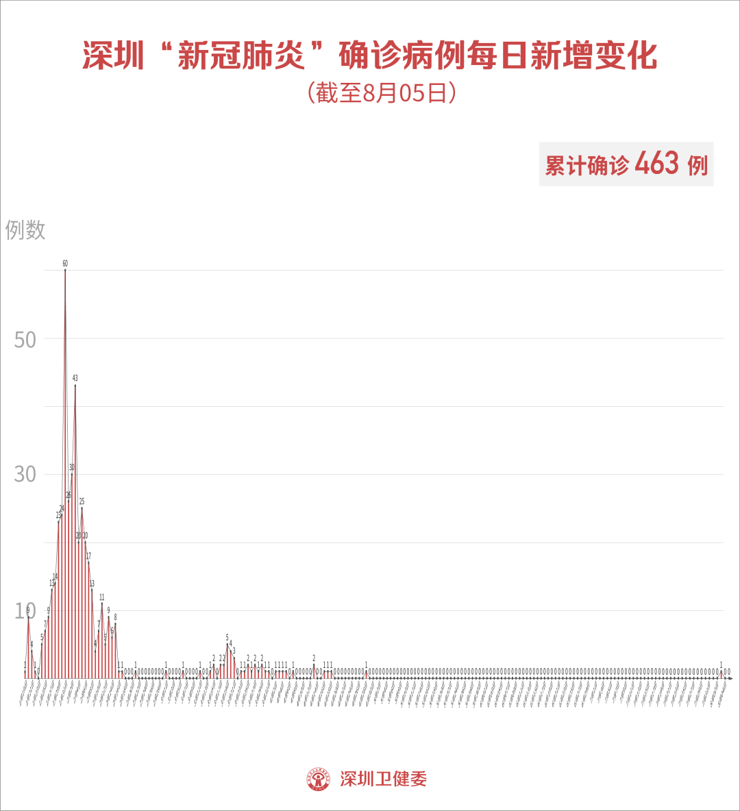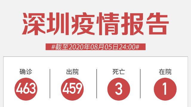 截至8月5日24時,深圳市累計報告新冠肺炎確診病例463例。目前在院1例。