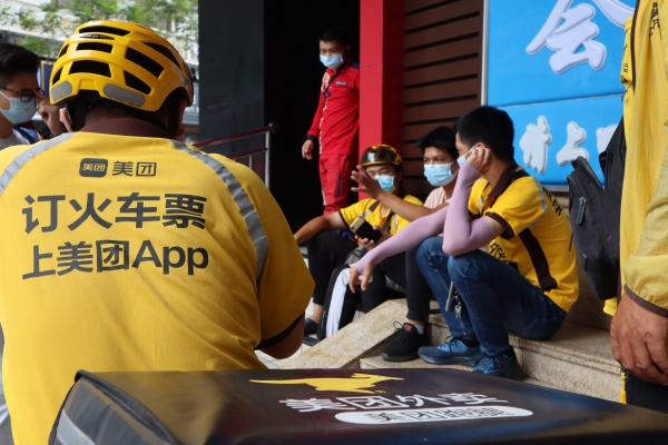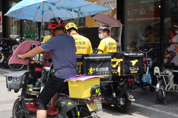 記者看到,街道上像呂先生這樣的外賣員數(shù)量不在少數(shù),短短十幾分鐘,記者就看到了近百名外賣員、派送員穿行街頭,將訂單送達(dá)客戶手中。他們趁取餐時(shí)間,在餐廳門口休息,不少人直接席地而坐,享受一下開放餐廳流出的一絲冷氣。