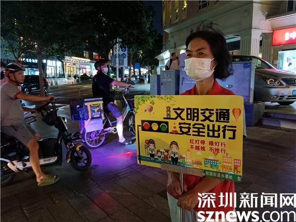 另一位堅守在國慶假期里的義工是宣仲英,今年62歲。她一站兩個小時,始終是精神抖擻,毫不松懈。看到有人試圖闖紅燈,她及時制止。看到有人不走斑馬線,她立刻提醒。她手持勸導(dǎo)文明出行的牌子,就像個交通警察,誰也別想在她的面前犯規(guī)。本來下午6點(diǎn)鐘,正是她給家人做晚餐,同家人一起吃飯的時間,但她聽說社區(qū)創(chuàng)文需要人,就跟家人商量,得到了家人的一致同意。她說,“我從內(nèi)地來到深圳,在老圍社區(qū)住了10年,感覺深圳做義工的氛圍特別濃厚,我也想做義工,為社會發(fā)揮余熱?!?/span>