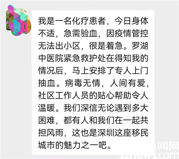 葉先生在護士為他抽血離開之后,送上了真摯地感謝?!盁o論我們遇到多大的苦難總會有人和我們一起共擔風(fēng)雨,這就是深圳的魅力”,葉先生說到。