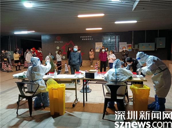 這天,老圍社區(qū)某棟樓全員檢測,社區(qū)緊急設(shè)立了臨時檢測點,社區(qū)黨委書記許少瓊忙前忙后指揮布置現(xiàn)場,調(diào)度管理處通知住戶下樓采樣,所有社區(qū)工作人員緊急行動起來,醫(yī)務(wù)人員也很快就位,居民積極配合,采樣工作有序進(jìn)行。