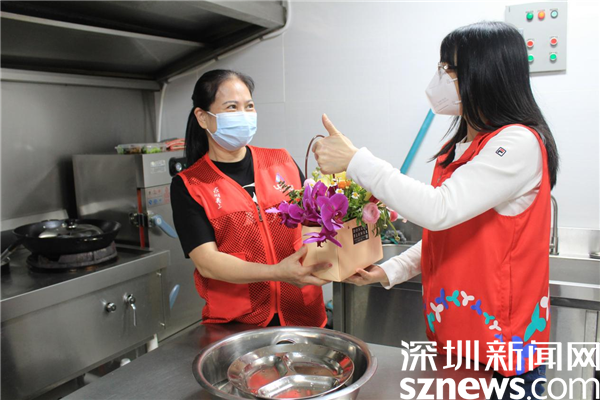 在社區(qū)廚房,老圍社區(qū)居民周文清正在忙碌,疫情開始以來,社區(qū)擔(dān)負(fù)著下沉人員和醫(yī)務(wù)人員的中餐和晚餐,每餐四五十人吃飯,任務(wù)繁重,廚師一人根本忙不過來。家住老圍花園的社區(qū)居民賴秀文、周文清得知情況后,立刻趕來幫廚,洗菜、切肉、炒菜、分裝飯盒、搞衛(wèi)生,樣樣都搶著干。羅湖區(qū)最美家庭賴秀文,一連兩個星期在社區(qū)幫廚,發(fā)揮她高超的廚藝,將每一道菜都做得色香味俱全。有了這些熱心居民的協(xié)助,一線人員得以及時吃上熱乎乎的飯菜,保障了防疫工作有序進(jìn)行。她們用自己的方式參與疫情防控,為社區(qū)安寧貢獻(xiàn)一己之力。