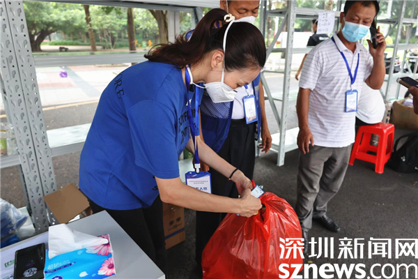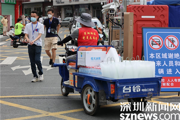 在新平村口,記者看到村口外圍已用水馬進(jìn)行合圍,來(lái)自街道、疾控、社區(qū)還有大望實(shí)業(yè)股份有限公司、梧桐山實(shí)業(yè)股份有限公司等單位的工作人員正在準(zhǔn)備開(kāi)展工作。在合圍的多個(gè)出入口處設(shè)置了快遞、外賣投放點(diǎn),由防疫人員為中、高風(fēng)險(xiǎn)的居民送貨上門(mén)。