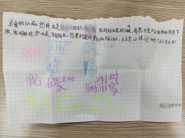 “親愛的lín dǎo您好……我媽媽在您那工作,這些天都沒能陪我,請你讓她6點(diǎn)30分下班可以嗎?”,1月13日,羅湖區(qū)南湖街道羅湖社區(qū)黨委書記姜德榮收到了一封特別的來信。這封信來自社區(qū)工作人員彭女士可愛的女兒,信上的內(nèi)容圖文并茂,表達(dá)了一個(gè)10歲小女孩的小心愿,希望媽媽可以早點(diǎn)下班,回家陪她。