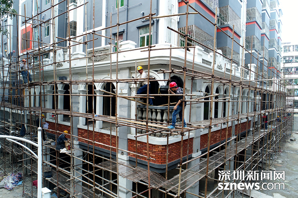 12月14日下午,水圍村改造的村民房的建筑鋼架還沒有拆除,建筑工人正在對外立面進(jìn)行粉刷