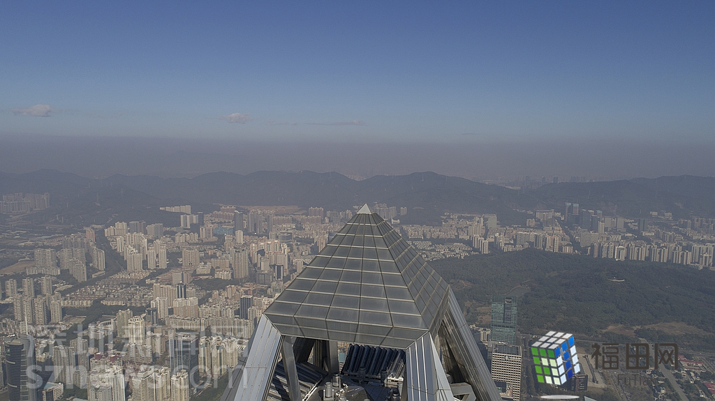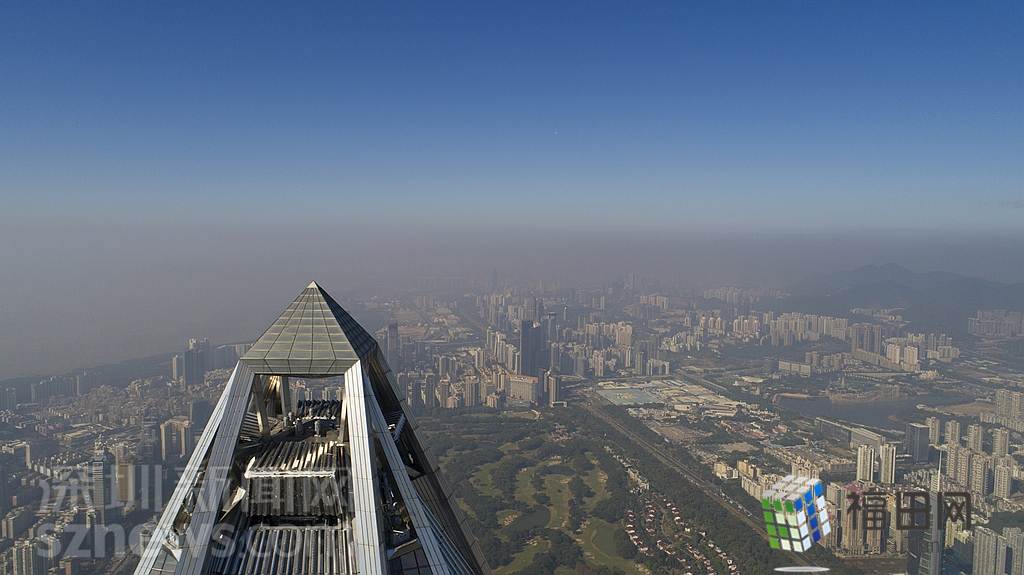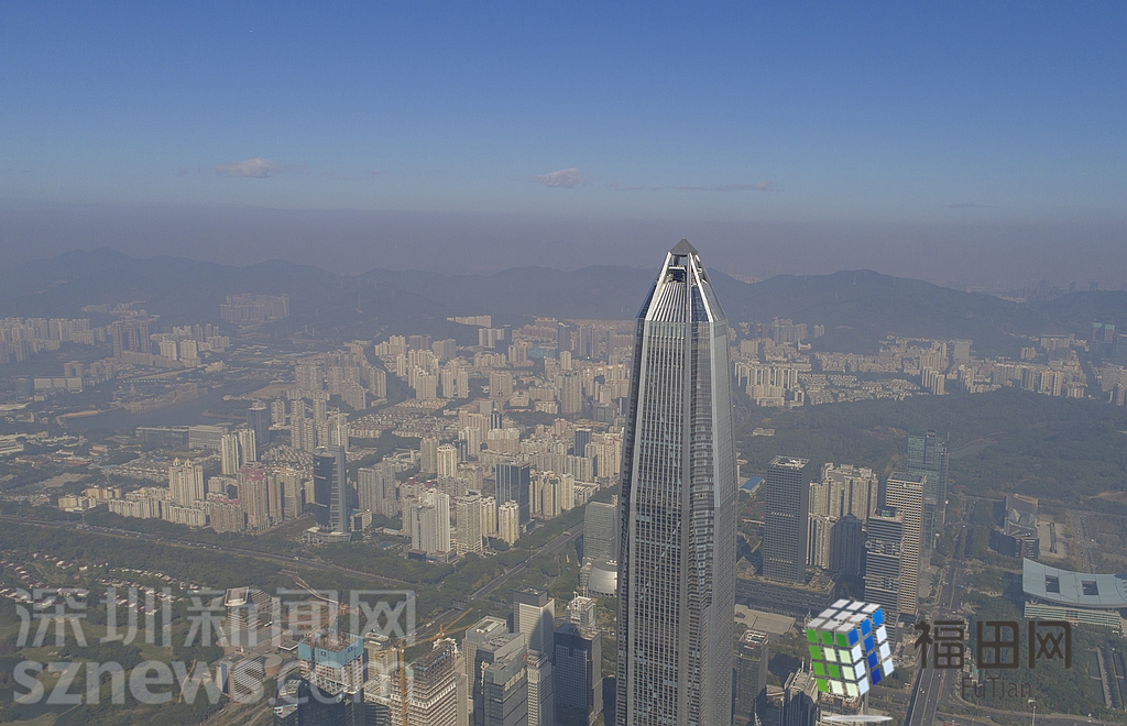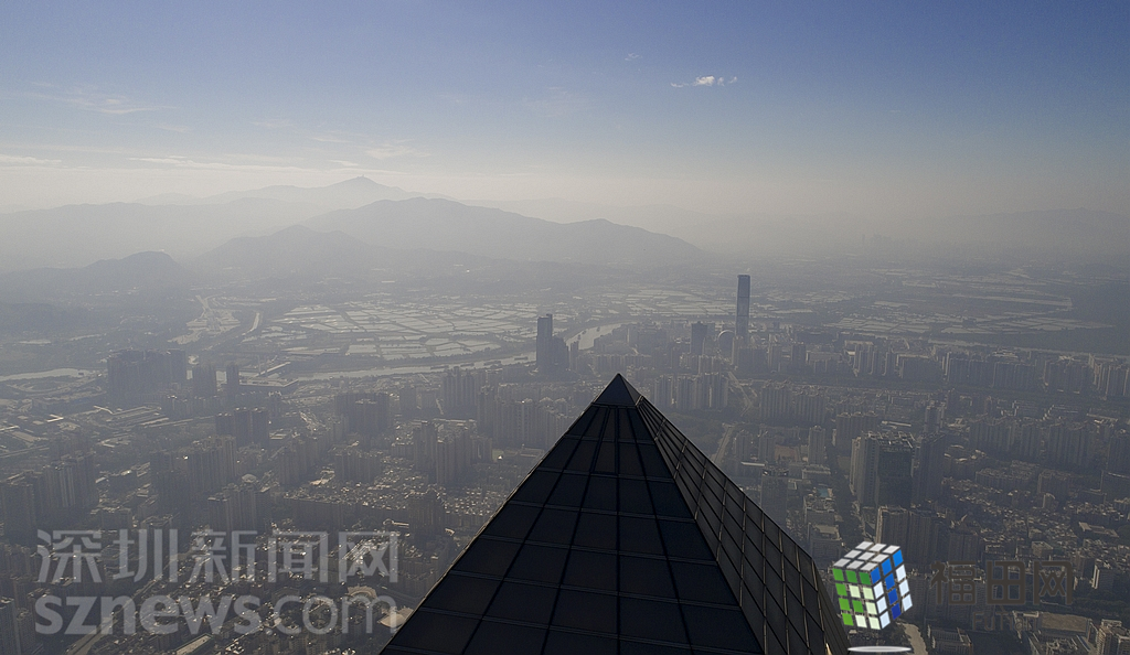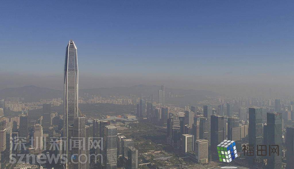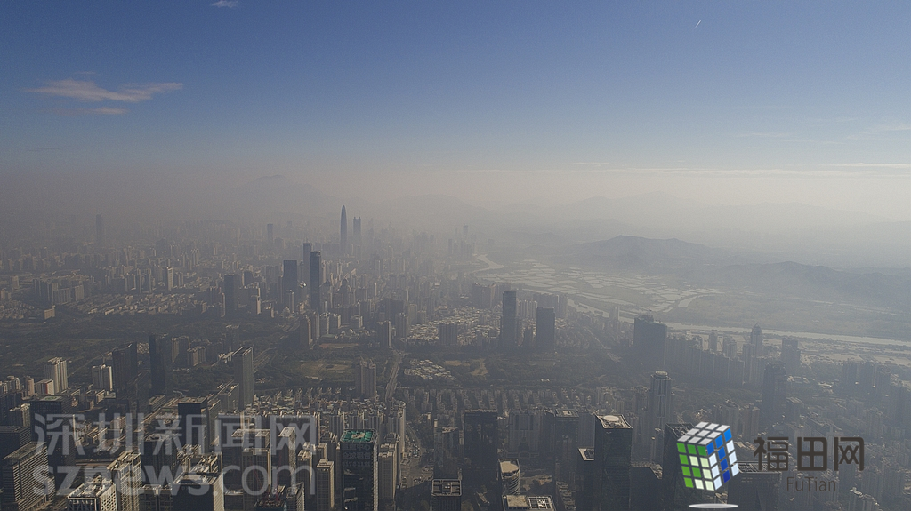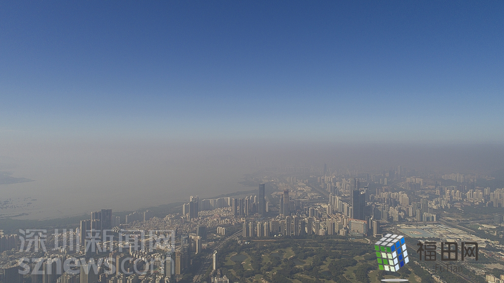 1月18日上午,記者操控?zé)o人機(jī)俯瞰深圳中心區(qū)發(fā)現(xiàn),灰霾將天空“割裂”成一道涇渭分明的界線,把城市籠罩得如同一個(gè)充滿(mǎn)霧靄的森林。從平安金融大廈的上空遠(yuǎn)眺,西南面的深圳灣在灰霾的籠罩下變成了一片“沙漠”,東面的京基一百幾乎被灰霾“吞沒(méi)”,北邊平時(shí)肉眼可看的梅林山也因?yàn)槟芤?jiàn)度較低變得若隱若現(xiàn),南面的米埔濕地也被云遮霧繞。