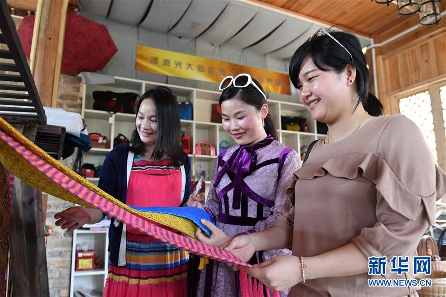 4月19日,在廣西南寧市青秀區(qū)南陽鎮(zhèn)施厚村古岳坡,游客在參觀用于制作民族工藝品的布料。今年“壯族三月三”假期期間,不少市民游客前往鄉(xiāng)村旅游觀光,激發(fā)了一股鄉(xiāng)村旅游小熱潮。“壯族三月三”是廣西壯族自治區(qū)確定的法定假期。新華社記者陸波岸 攝