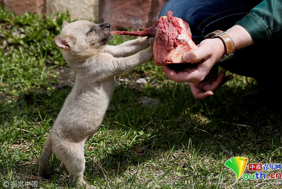 當(dāng)?shù)貢r(shí)間2018年5月11日,俄羅斯克拉斯諾雅茨克,當(dāng)?shù)貏?dòng)物園飼養(yǎng)員給一只1月大的印度野狗Gelya喂食。