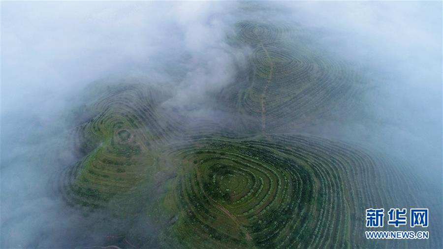 云霧繚繞的寧夏彭陽縣金雞坪梯田公園(7月17日無人機(jī)拍攝)。 新華社記者 王鵬 攝