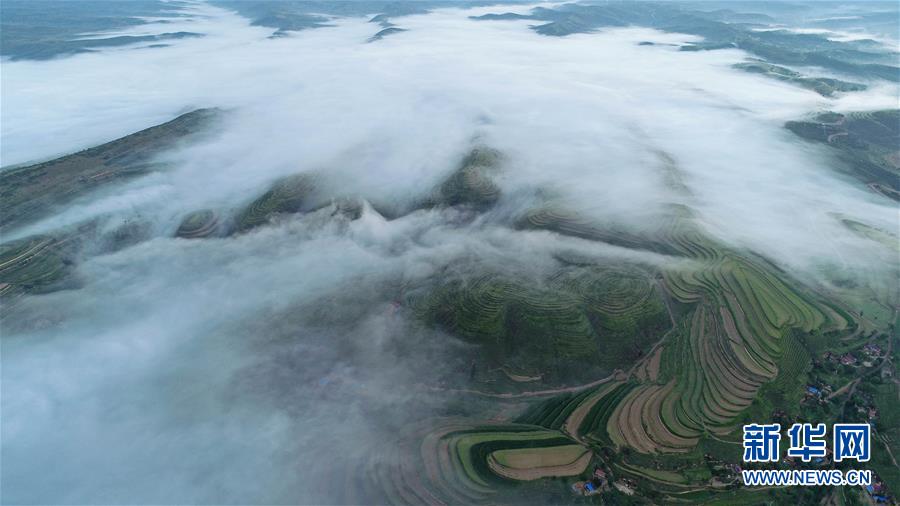 云霧繚繞的寧夏彭陽(yáng)縣金雞坪梯田公園(7月17日無(wú)人機(jī)拍攝)。 新華社記者 王鵬 攝