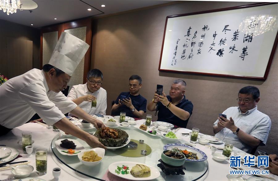 杭州酒家老板吳瑞康向記者介紹“叫化雞”的制作工序(6月16日攝)。 金庸在武俠小說《神雕俠侶》中借郭靖之口說過: “為國為民,俠之大者?!蔽鋫b精神在香港備受推崇,有其心向中華文化的情感基礎(chǔ)。在這個(gè)國際美食之都,品味舌尖上的武俠味,內(nèi)中的感覺別有深意。新華社記者 李鵬 攝