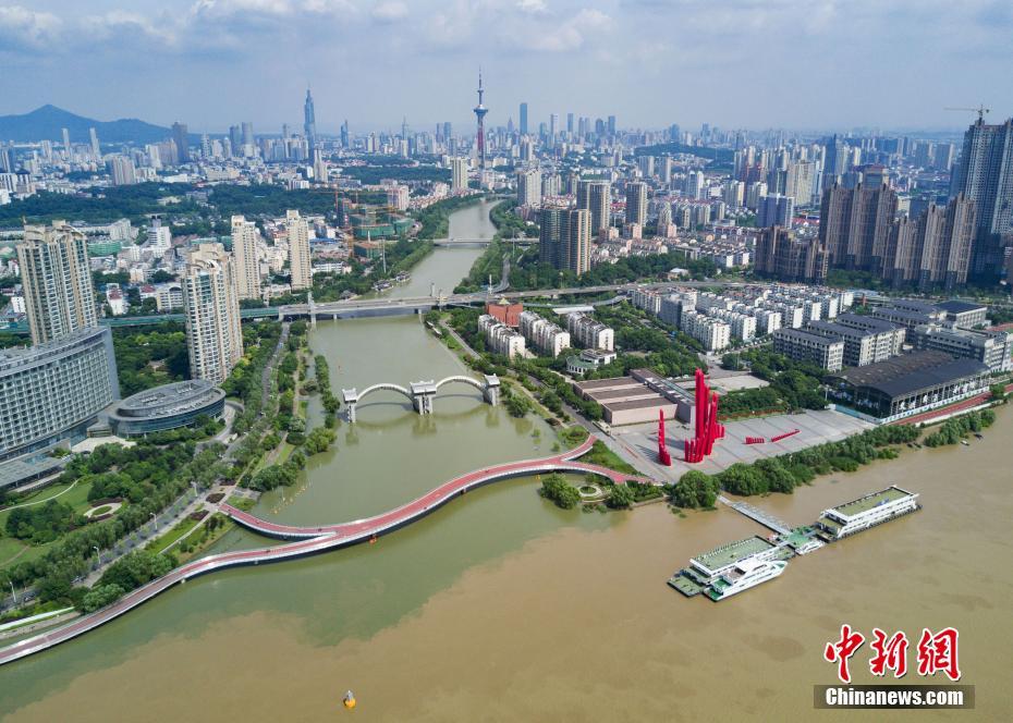 7月10日,航拍長(zhǎng)江與南京秦淮河交匯處,江水與河水“涇渭分明”。當(dāng)日,江蘇水利廳發(fā)布的水情信息顯示,長(zhǎng)江南京段水位已降至警戒線(xiàn)以下。中新社記者泱波 攝