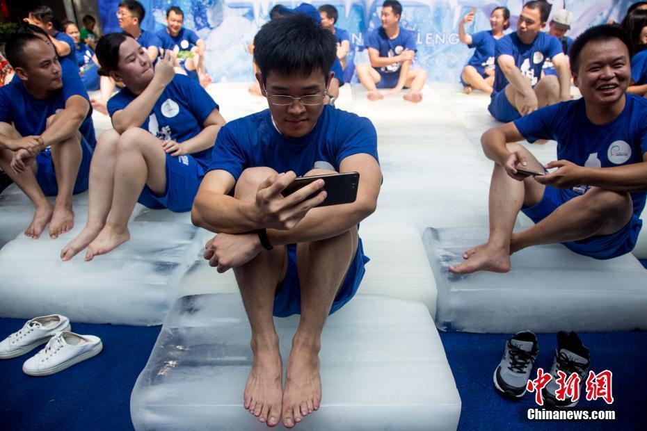 8月11日,在企鵝館舉行的決賽中,工作人員給參賽選手桶里加冰塊。當(dāng)日,一場充滿趣味性的“冰極挑戰(zhàn)賽”在武漢海昌極地海洋世界上演,參賽者們經(jīng)過“極地初體驗”和“極寒企鵝館耐寒挑戰(zhàn)”兩個環(huán)節(jié),堅持時間長者獲勝。中新社記者張暢 攝
