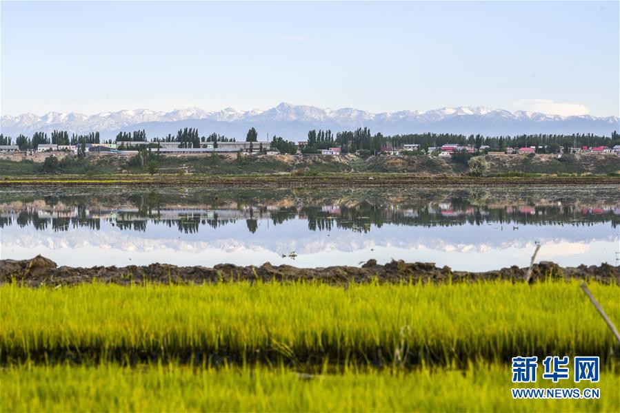 在新疆察布查爾錫伯自治縣種羊場(chǎng)托海依村拍攝的一處農(nóng)田,秧苗與遠(yuǎn)處的雪山相映成趣(5月21日攝)。近日,隨著氣溫漸高,地處新疆伊犁河谷的察布查爾錫伯自治縣迎來(lái)插秧高峰期,田間地頭一派繁忙景象。塊塊稻田水滿如鏡,田間防護(hù)林枝繁葉茂,遠(yuǎn)處雪山依稀可見(jiàn),如一幅在大地上鋪展開(kāi)的生態(tài)畫(huà)卷。新華社記者胡虎虎 攝