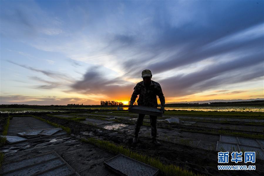 新疆察布查爾錫伯自治縣種羊場托海依村的村民在農(nóng)田里搬運秧苗(5月21日攝)。近日,隨著氣溫漸高,地處新疆伊犁河谷的察布查爾錫伯自治縣迎來插秧高峰期,田間地頭一派繁忙景象。塊塊稻田水滿如鏡,田間防護(hù)林枝繁葉茂,遠(yuǎn)處雪山依稀可見,如一幅在大地上鋪展開的生態(tài)畫卷。新華社記者胡虎虎 攝
