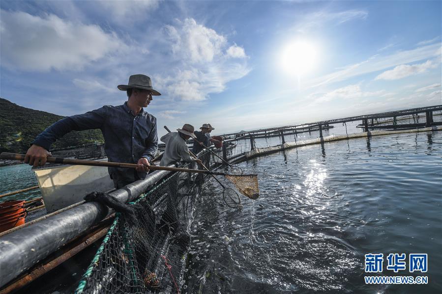 8月18日,南麂島海域內(nèi)的“海上牧場”養(yǎng)殖區(qū)內(nèi),漁民正捕撈大黃魚,處于仿生養(yǎng)殖環(huán)境的大黃魚需要生長2至3年。進(jìn)入8月,浙江省溫州市平陽縣南麂鎮(zhèn)海域上大片的大黃魚、貽貝等特色海產(chǎn)品養(yǎng)殖區(qū)域迎來豐收季節(jié),養(yǎng)殖戶們駕駛漁船在養(yǎng)殖區(qū)海域進(jìn)行打撈收獲,在碧海藍(lán)天下構(gòu)成了一幅“海上牧場”的美麗豐收景象。近年來,南麂鎮(zhèn)政府引導(dǎo)漁民養(yǎng)殖戶充分發(fā)揮“靠海吃?!钡馁Y源優(yōu)勢(shì),大力發(fā)展海洋養(yǎng)殖經(jīng)濟(jì)和海島旅游經(jīng)濟(jì),實(shí)現(xiàn)了南麂由“生態(tài)美”向“產(chǎn)業(yè)美”,“產(chǎn)業(yè)美”向“經(jīng)濟(jì)美”的轉(zhuǎn)變。同時(shí)該鎮(zhèn)堅(jiān)持以大黃魚、貽貝等為特色產(chǎn)業(yè)支撐,精準(zhǔn)發(fā)展高效海洋養(yǎng)殖業(yè),重點(diǎn)培養(yǎng)一批新型職業(yè)漁民,依靠專業(yè)技術(shù)支持,實(shí)現(xiàn)深海仿生養(yǎng)殖,讓好生態(tài)造就好品質(zhì),重點(diǎn)打造南麂養(yǎng)殖品牌,組建營銷網(wǎng)絡(luò),拓展特色海產(chǎn)品市場。新華社記者 徐昱攝