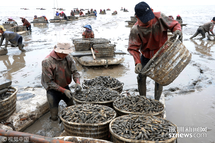 2018年8月20日,廣東東莞,虎門新灣漁港的漁民們正在分揀漁獲。