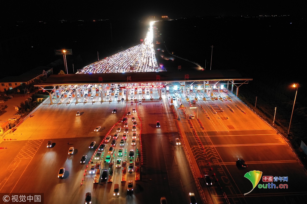 2018年9月24日,鄭州,在河南鄭州南收費(fèi)站,排隊(duì)出高速的汽車仍然排著長(zhǎng)長(zhǎng)的隊(duì)伍。當(dāng)天是中秋節(jié)小長(zhǎng)假的最后一天,全國(guó)各地迎來(lái)返程客流高峰。