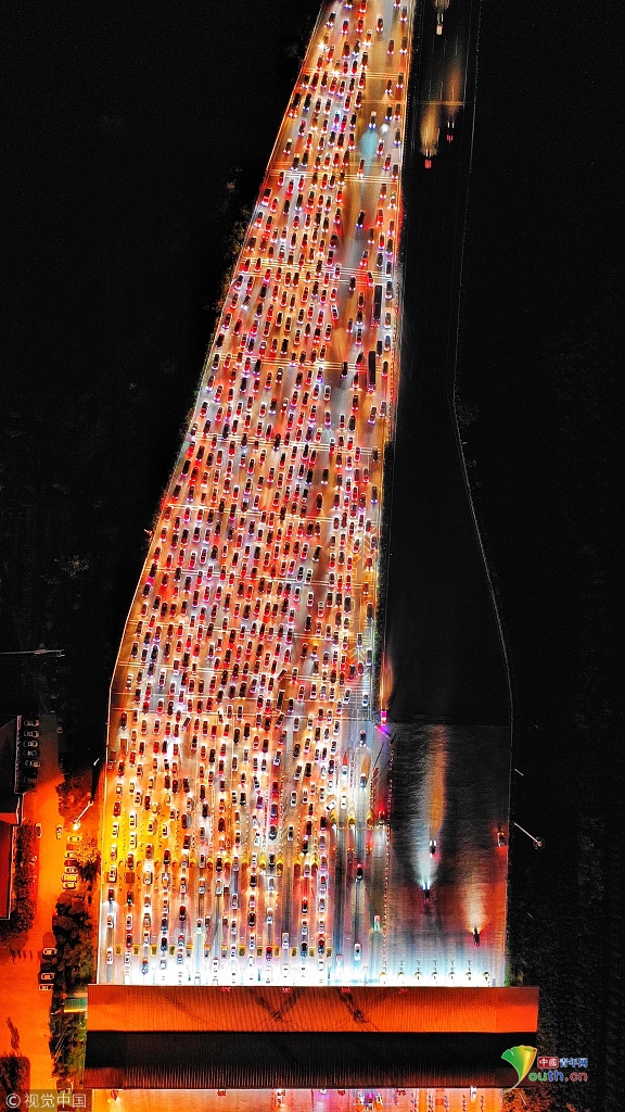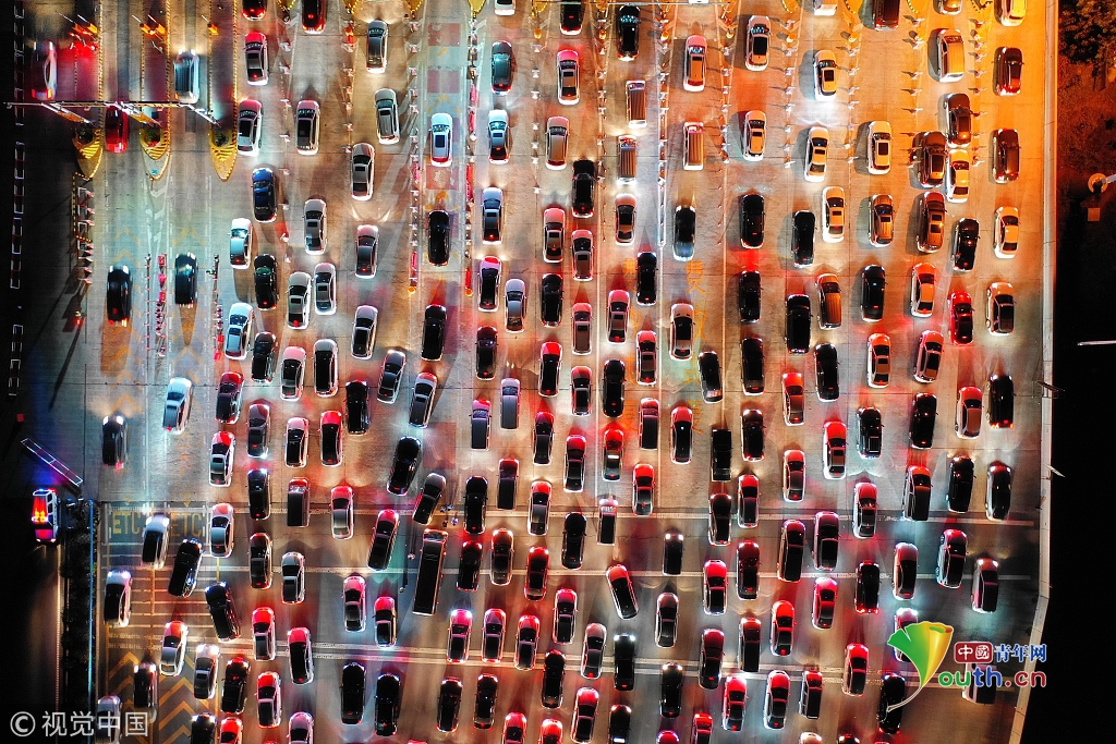 從天上鳥瞰,車輛的尾燈宛若一條紅色的巨龍,望不到盡頭,場面十分壯觀。