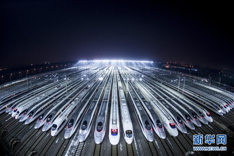 2018年2月1日凌晨,動(dòng)車組??吭谖錆h動(dòng)車段的存車線上,準(zhǔn)備進(jìn)行檢修和保溫作業(yè)。近百組在武漢動(dòng)車段經(jīng)過檢修、保溫作業(yè)的動(dòng)車組蓄勢待發(fā),迎接春運(yùn)。新華社記者 肖藝九 攝