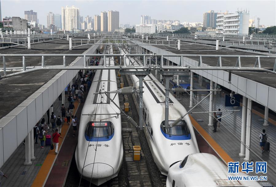 在廣西南寧站,旅客進(jìn)入站臺準(zhǔn)備乘坐動(dòng)車出行(9月4日攝)。 廣西壯族自治區(qū)成立60年來,鐵路建設(shè)發(fā)生翻天覆地的變化。來自中國鐵路南寧局集團(tuán)有限公司的數(shù)據(jù)顯示,1958年廣西鐵路總里程為1346.3公里,如今廣西鐵路總里程達(dá)5191公里。廣西與周邊相鄰省份間實(shí)現(xiàn)動(dòng)車“公交化”開行。此外,北部灣港—重慶班列、東盟海產(chǎn)品冷鏈班列、“百色一號”果蔬專列等的開通和運(yùn)營,強(qiáng)化了鐵路供給的針對性和有效性。鐵路成為助推廣西經(jīng)濟(jì)社會快速發(fā)展的“大動(dòng)脈”。 新華社記者陸波岸攝