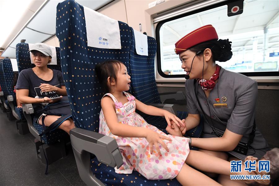 在南寧東站,一名列車工作人員在和一名小朋友交流(2017年8月5日攝)。 廣西壯族自治區(qū)成立60年來,鐵路建設(shè)發(fā)生翻天覆地的變化。來自中國鐵路南寧局集團(tuán)有限公司的數(shù)據(jù)顯示,1958年廣西鐵路總里程為1346.3公里,如今廣西鐵路總里程達(dá)5191公里。廣西與周邊相鄰省份間實(shí)現(xiàn)動(dòng)車“公交化”開行。此外,北部灣港—重慶班列、東盟海產(chǎn)品冷鏈班列、“百色一號”果蔬專列等的開通和運(yùn)營,強(qiáng)化了鐵路供給的針對性和有效性。鐵路成為助推廣西經(jīng)濟(jì)社會快速發(fā)展的“大動(dòng)脈”。 新華社記者陸波岸攝