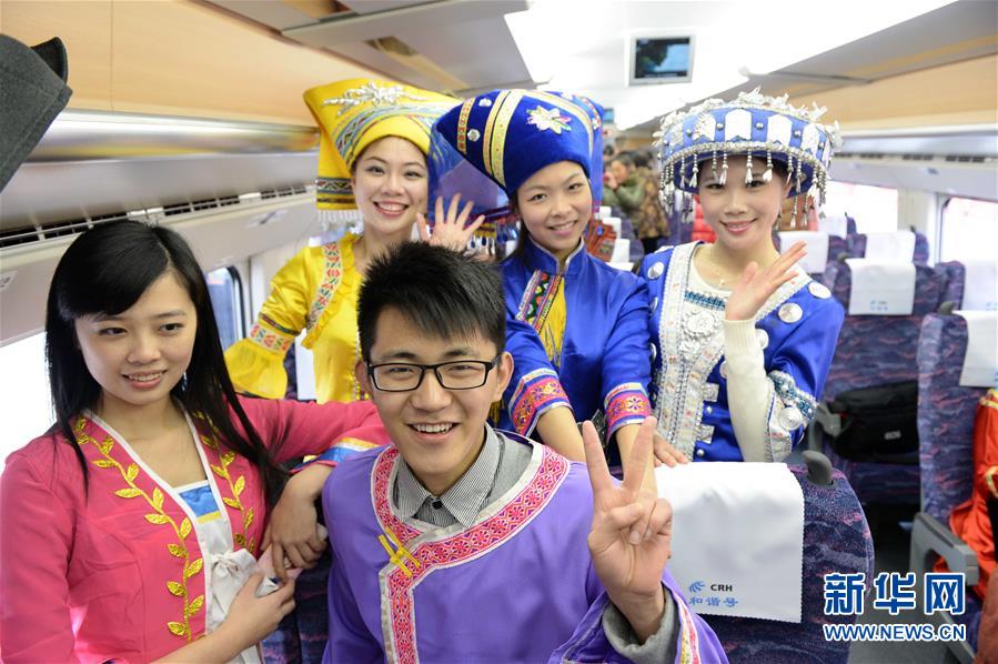 在廣西南寧站,身著民族服裝的乘客搭乘動(dòng)車準(zhǔn)備出行(2013年12月30日攝)。 廣西壯族自治區(qū)成立60年來,鐵路建設(shè)發(fā)生翻天覆地的變化。來自中國鐵路南寧局集團(tuán)有限公司的數(shù)據(jù)顯示,1958年廣西鐵路總里程為1346.3公里,如今廣西鐵路總里程達(dá)5191公里。廣西與周邊相鄰省份間實(shí)現(xiàn)動(dòng)車“公交化”開行。此外,北部灣港—重慶班列、東盟海產(chǎn)品冷鏈班列、“百色一號”果蔬專列等的開通和運(yùn)營,強(qiáng)化了鐵路供給的針對性和有效性。鐵路成為助推廣西經(jīng)濟(jì)社會快速發(fā)展的“大動(dòng)脈”。 新華社記者周華攝
