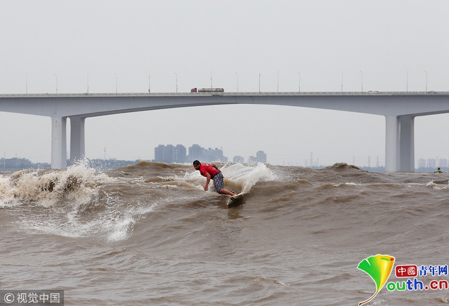 中國(guó)青年網(wǎng)北京9月27日電 2018年9月26日下午,杭州錢江江面上,一個(gè)個(gè)沖浪弄潮兒英姿颯爽。在錢塘江里戲浪前行的,正是參與錢塘江槳板精英賽的高手們。圖片作者/視覺中國(guó)