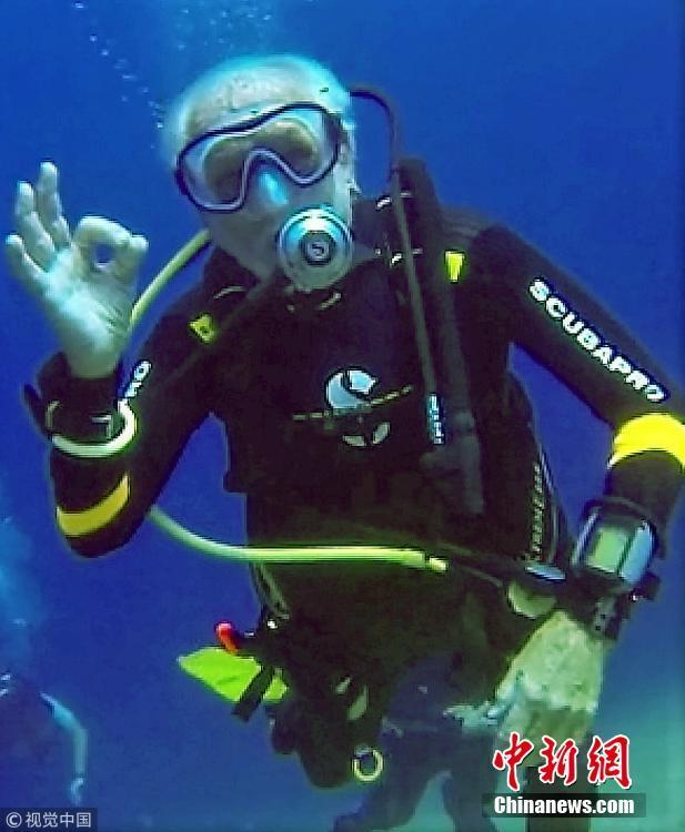 當(dāng)?shù)貢r間2018年9月1日,塞浦路斯,95歲的英國潛水員雷·伍利(Ray Woolley)以44分鐘下潛40.5米的成績打破了自己94歲達成的記錄(41分鐘下潛38.1米),二度刷新了世界上年齡最大的男性潛水員最好成績。在此次下潛中,這位二戰(zhàn)退伍老兵對距塞浦路斯南部城鎮(zhèn)拉納卡約2公里處的海域進行了探索,1980年一艘名為“芝諾比亞號”(Zenobia)的貨船在這里進行首次航行時沉沒。圖片來源:視覺中國