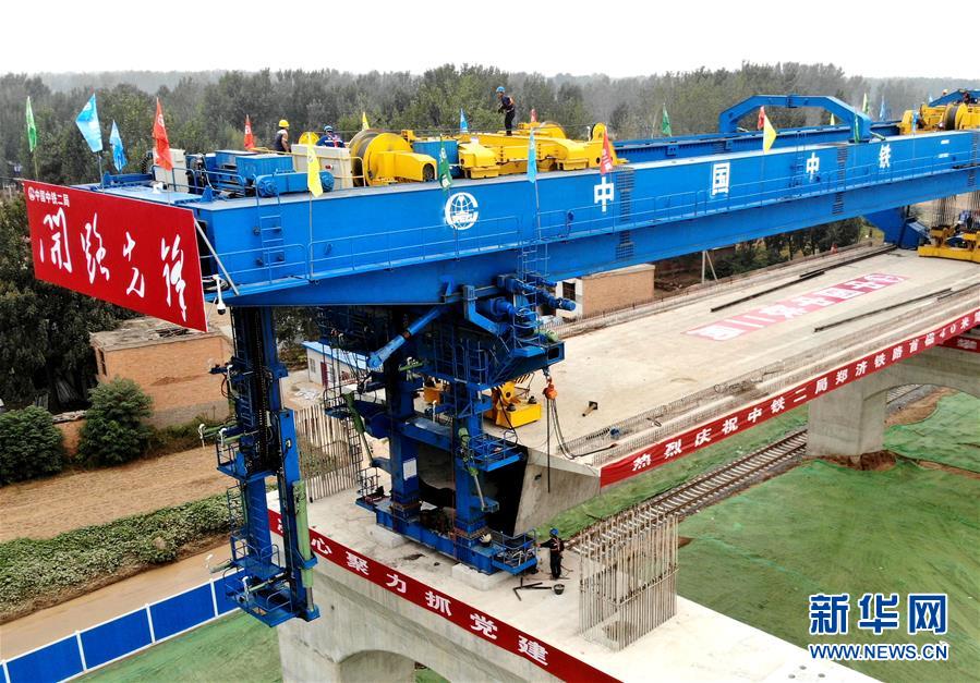 9月27日,中鐵二局的施工人員使用大型機(jī)械在鄭(州)濟(jì)(南)高速鐵路(鄭濮段)站前工程VI標(biāo)施工現(xiàn)場(chǎng)架設(shè)40米簡(jiǎn)支箱梁(無人機(jī)拍攝)。 新華社記者李安攝