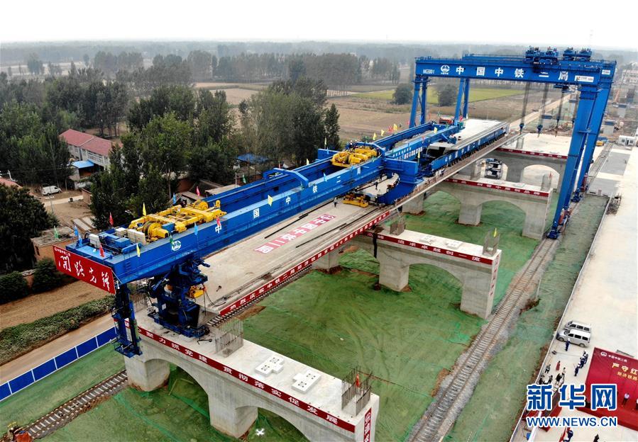 9月27日,中鐵二局的施工人員使用大型機(jī)械在鄭(州)濟(jì)(南)高速鐵路(鄭濮段)站前工程VI標(biāo)施工現(xiàn)場(chǎng)架設(shè)40米簡(jiǎn)支箱梁(無(wú)人機(jī)拍攝)。 新華社記者李安攝
