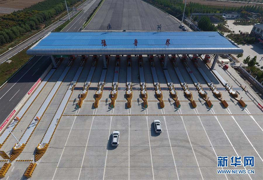 9月28日,車輛準備通過河南省南樂縣的南(樂)林(州)高速豫魯界收費站(無人機拍攝)。新華社記者 馮大鵬 攝