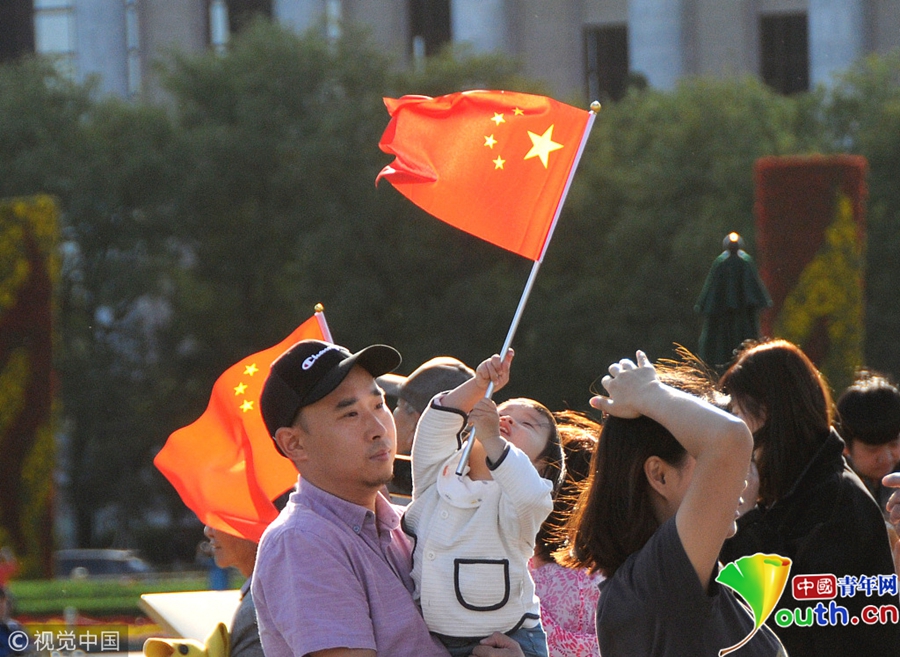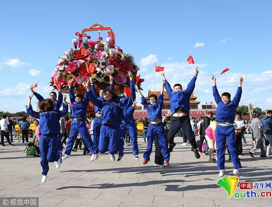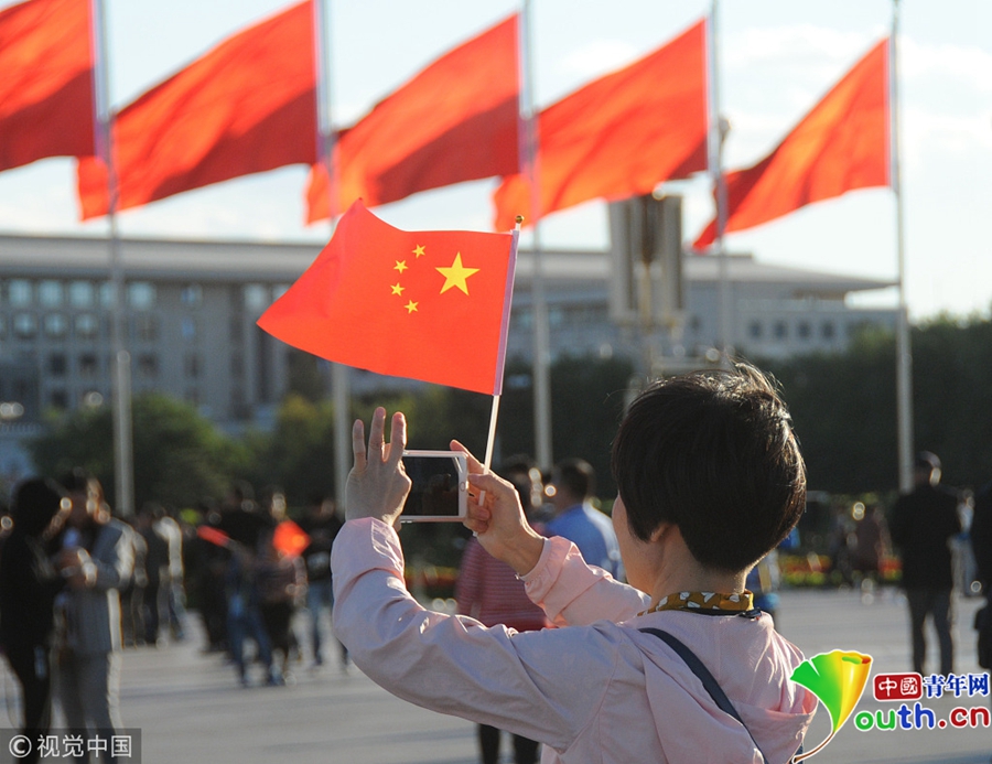 2018年9月29日,北京迎來高顏值好天氣,天安門廣場“祝福祖國”花壇在藍(lán)天白云映襯下壯美如畫。游客紛紛拿起手機、相機拍照留影充滿節(jié)日氣氛。